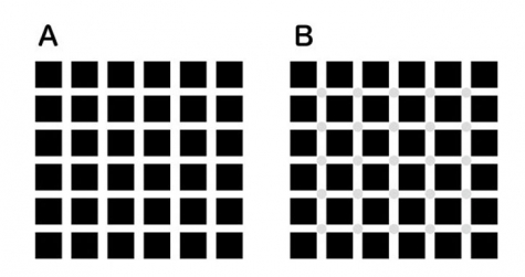 在白色背景上排列著黑色正方形。在正方形的中間可以看見灰色圓點。A、B兩個圖形中哪里存在區(qū)別呢?實際上,B圖形中在相鄰正方形的角與角之間畫有淡灰色圓點,但是A圖中沒有畫圓點。但是,我們是不是在A圖中看起來也有灰色圓點呢?這種錯視稱之為“赫曼方格錯視”。